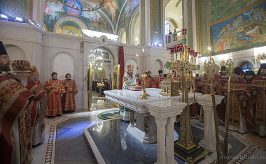 Его Высокопреосвященству сослужили заместитель председателя Синодального отдела по монастырям и монашеству архимандрит Стефан (Тараканов), насельник Сретенского монастыря архимандрит Иов (Гумеров), братия обители в священном сане.