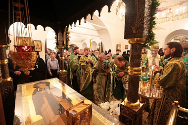 Всенощное бдение было отслужено в храме преподобного Стефана, где под спудом почивают его святые мощи. На великой вечерне лития совершалась на улице.