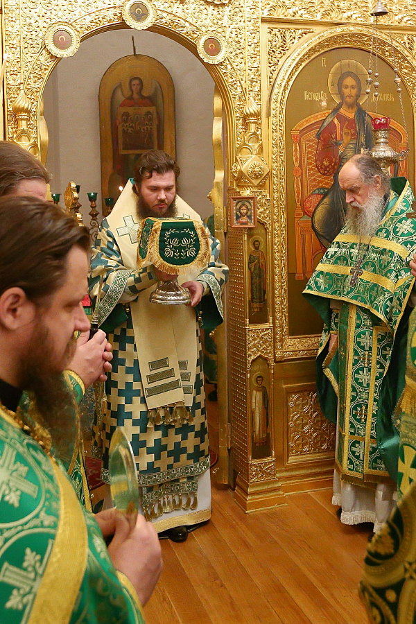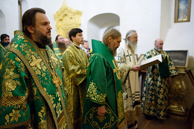 Его Высокопреосвященству сослужили председатель Синодального отдела по монастырям и монашеству, наместник Троице-Сергиевой лавры архиепископ Феогност, праздновавший в этот день 30-летие исполнения послушания наместника обители преподобного Сергия, архиепископ Верейский Амвросий, ректор Московских духовных школ, и священноиноки лавры.