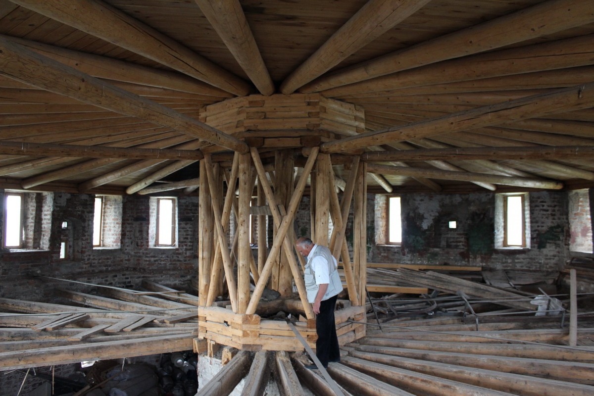 Первоначально башня завершалась высоким тесовым шатром с дозорной вышкой («смотрильней»), а в XVIII веке его сменила сферическая кровля, которая сгорела в 1920 г.
