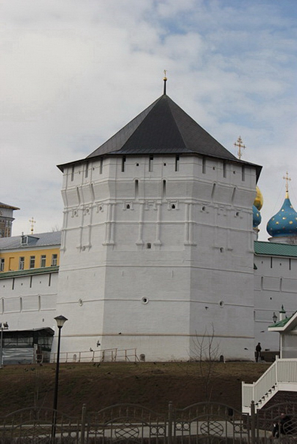Пятницкая башня, восьмигранная в плане, располагается в юго-восточном углу монастырской ограды, сооружена в 1640 году. Это одно из самых мощных крепостных сооружений, построенных в XVII веке на месте разрушенной взрывом «в осадное время» башни. Высота башни до верха зубцов составляет 25 м, по диагонали – 21 м. В шести ярусах башни имеется 77 бойниц. На всю высоту башни проходит восьмигранный каменный пилон, который поддерживает своды и бревенчатые накаты междуэтажных перекрытий.