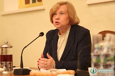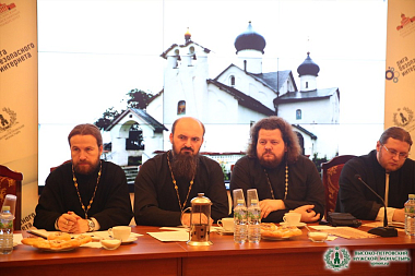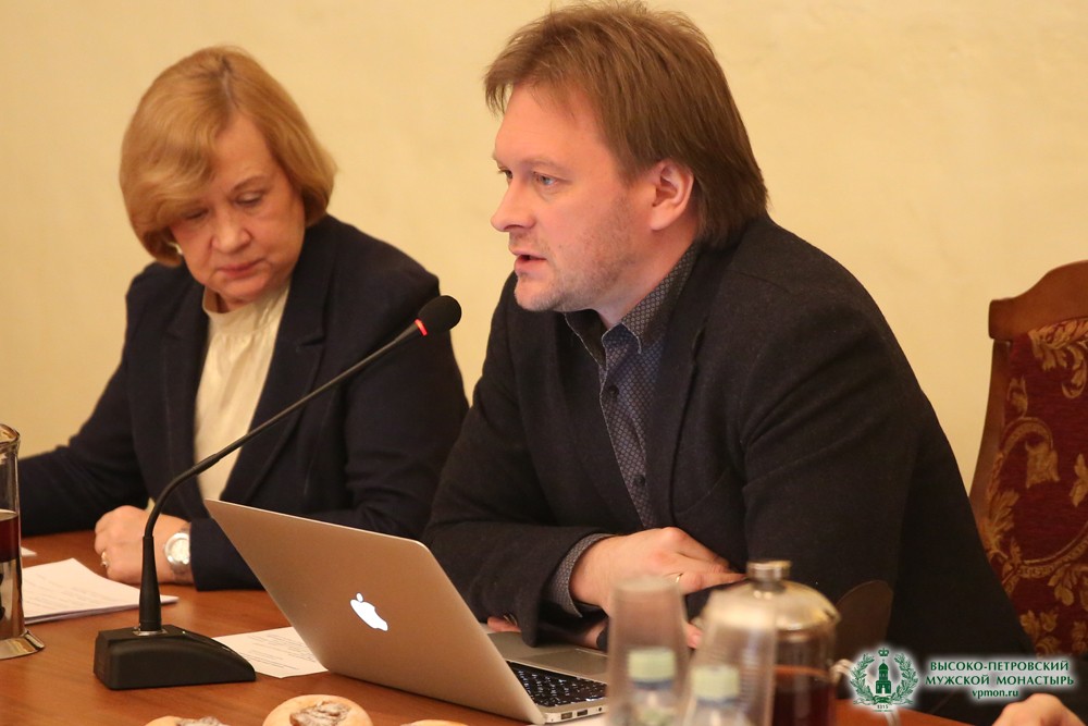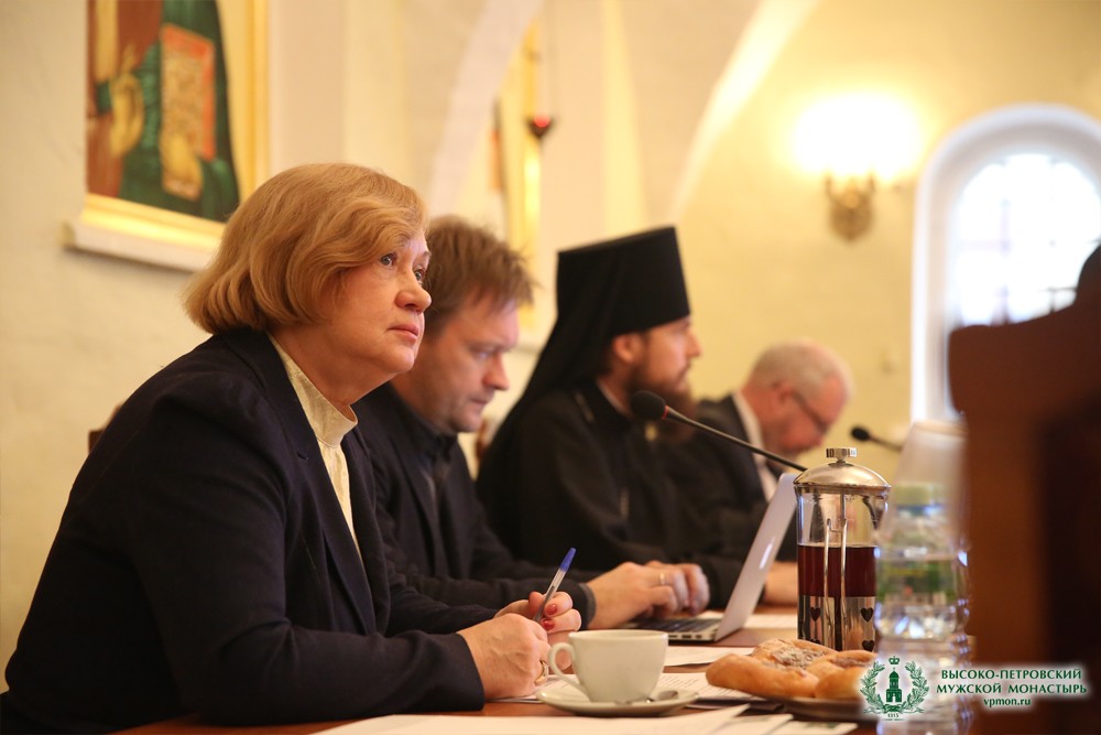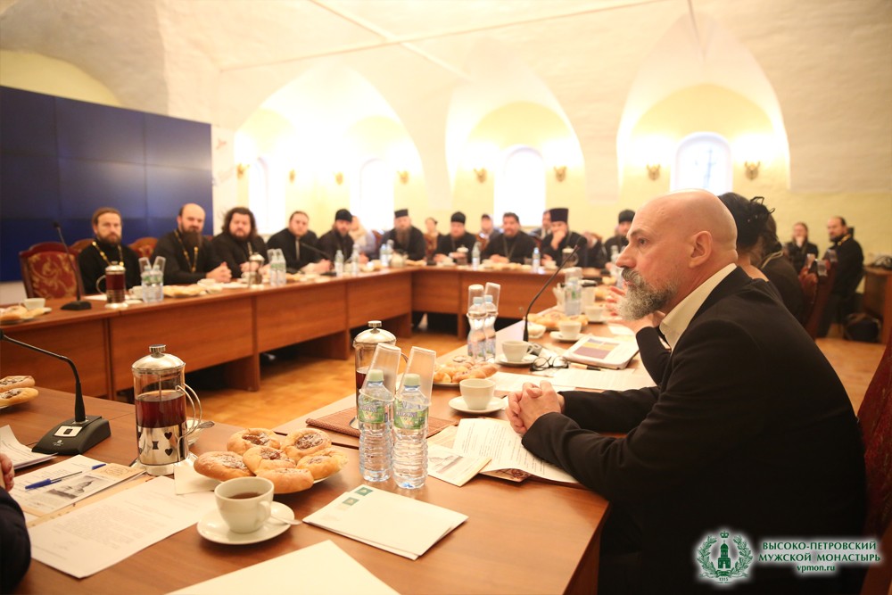 Открывая заседание, к собравшимся обратился с приветственным словом наместник Высоко-Петровского монастыря игумен Петр (Еремеев). Его Высокопреподобие подчеркнул актуальность заданной темы для российского общества и на примере возрождения Высоко-Петровского монастыря обратил внимание присутствующих на необходимость учитывать аспекты сохранения как архитектурного, так и нематериального наследия.