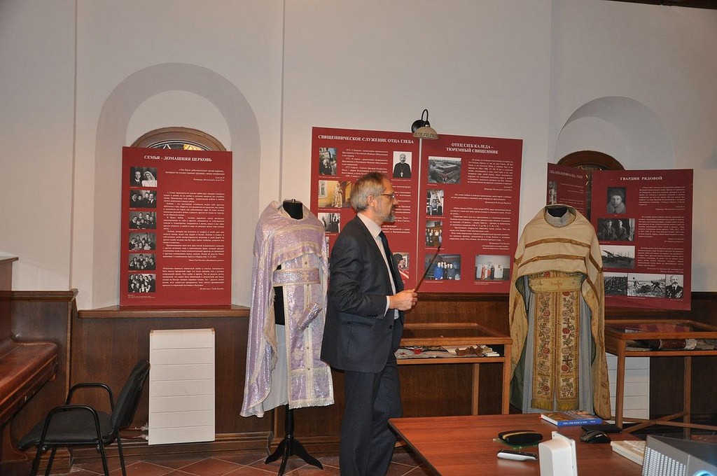 Используя стенды и экспонаты витрин, Василий Глебович продемонстрировал также, каким образом готовились облачения и место для совершения Литургии в их «домовой церкви» в московской квартире, описал некоторые особенности взаимообщения тайного священника Глеба Каледы с другими священнослужителями, близкими или совсем незнакомыми с ним.