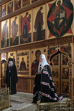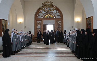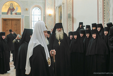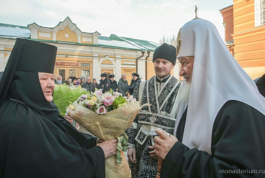По окончании богослужения игумения Олимпиада приветствовала Предстоятеля Русской Православной Церкви и преподнесла Его Святейшеству крест и покровцы.