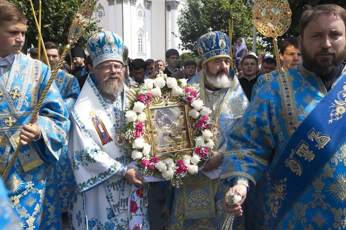 В этот день по окончании поздней Литургии состоялся крестный ход, во время которого Почаевская чудотворная икона была перенесена из Успенского собора Лавры в новый Преображенский собор. В 14:00 в Преображенском соборе была отслужена малая вечерня, по завершении которой перед чудотворной иконой три лаврских хора пели на распев соборный акафист, возглавленный Местоблюстителем Киевской митрополичьей кафедры Высокопреосвященнейшим Онуфрием, митрополитом Черновицким и Буковинским, в сослужении собора архипастырей и духовенства. Затем были прочитаны кафизмы.