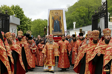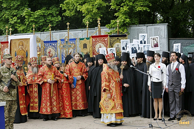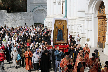 По окончании Божественной литургии состоялся крестный ход, который возглавил наместник Лавры архиепископ Святогорский Арсений. Начался он от Успенского собора обители и завершился на горе Артема у мемориального комплекса – братской могилы воинов, павших в сражениях за освобождение Святых Гор от фашистских захватчиков.