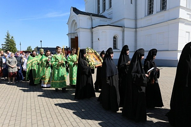 В Кресто-Воздвиженском соборе монастыря отслужили позднюю Литургию, а затем возглавили крестный ход архиепископ Новогрудский и Слонимский Гурий, епископ Могилевский и Мстиславский Софроний, епископ Гомельский и Жлобинский Стефан, епископ Туровский и Мозырский Леонид и епископ Молодечненский и Столбцовский Павел.