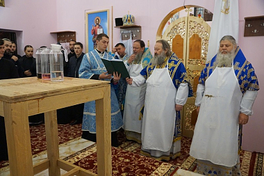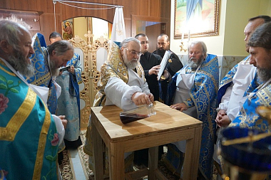 Перед Божественной литургией Предстоятель Украинской Православной Церкви совершил чин освящения новых монастырских храмов: церкви в честь Великомученика Георгия, а также храма в честь Преподобных отцов Оптинских и святителя Тихона, Патриарха Московского и всея Руси.