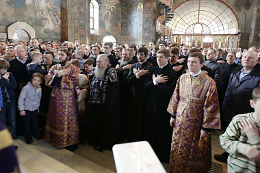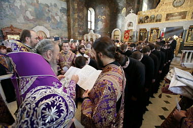 Вечером 3 апреля Предстоятель Украинской Православной Церкви совершил вечернее богослужение с чином пассии в Успенском соборе Киево-Печерской лавры.