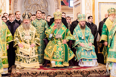 Затем в Трапезном храме преподобных Антония и Феодосия Киево-Печерской лавры состоялся годичный акт Киевских Духовных школ, который возглавил Предстоятель Украинской Православной Церкви.