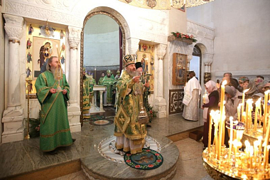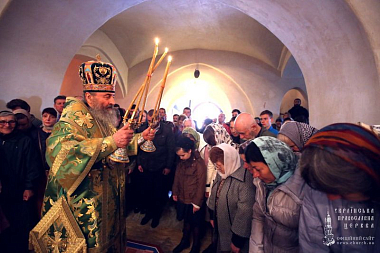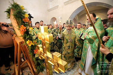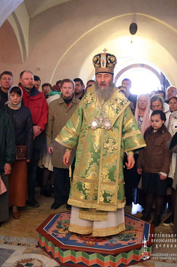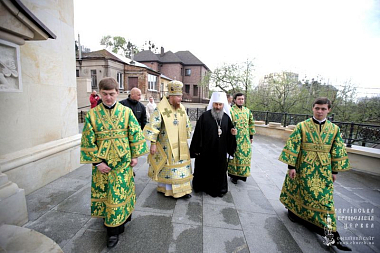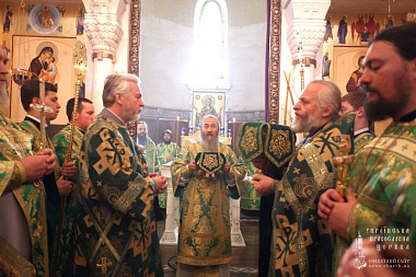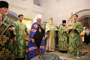 Его Блаженству сослужили: епископ Обуховский Иона; епископ Ирпенский Климент; наместник обители архимандрит Кассиан (Шостак); духовенство монастыря.