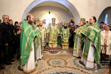 В завершение праздника Блаженнейший владыка в сопровождении наместника обители архимандрита Кассиана осмотрел храмы и пещеры Зверинецкого монастыря и ознакомился с ходом реставрационных работ.