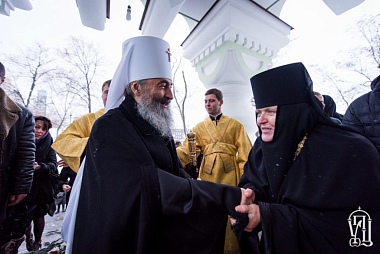 Его Блаженству сослужили председатель Отдела внешних церковных связей Украинской Православной Церкви митрополит Луганский и Алчевский Митрофан, епископ Фастовский Дамиан, духовенство монастыря и гости в священном сане.