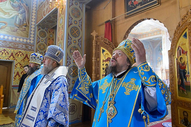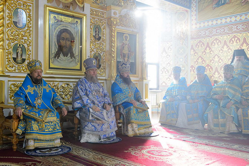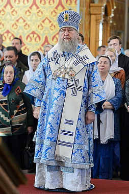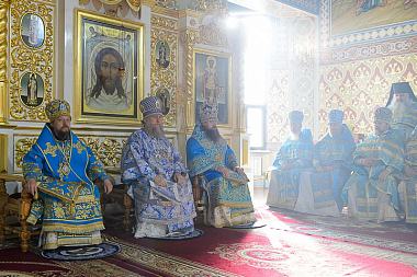 За Литургией возносились заупокойные молитвы о приснопамятных казахстанских иерархах архиепископе Софонии (Сокольском, †1877 г.) и епископе Никоне (Богоявленском, †1897 г.), погребенных у алтаря Софийского собора, и подвижнике благочестия митрополите Иосифе (Чернове, †1975 г.), чья гробница находится в Софийском соборе.