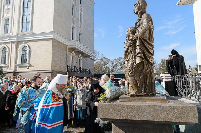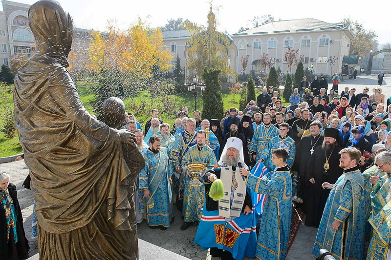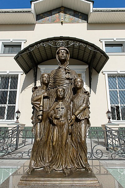 Затем на площади перед Духовно-культурным и административным центром Казахстанского митрополичьего округа имени митрополита Иосифа (Чернова) состоялось открытие и освящение памятника небесным покровительницам Семиречья – мученицам Вере, Надежде, Любови и матери их Софии. Памятник святым мученицам – подарок Иверско-Серафимовскому монастырю, жителям и гостям Южной столицы от благотворителей к памятным датам: 15-летию учреждения Митрополичьего округа Русской Православной Церкви в Республике Казахстан, 110-летию со дня основания и 15-летию возрождения обители.