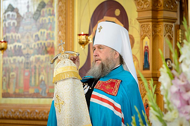 Богослужение завершилось славлением празднику Успения Пресвятой Богородицы и литией у гробницы митрополита Иосифа (Чернова), после чего митрополит Александр поздравил Преосвященных епископов, игумению Любовь, духовенство и прихожан с особым днем для православных казахстанцев, почитающих память митрополита Иосифа, и обратился к верующим с проповедью.