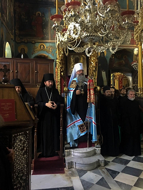 После праздничной братской трапезы с чином о панагии митрополит Кирилл и члены официальной делегации Русской Православной Церкви простились с братией Пантелеимоновой обители.
