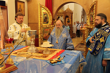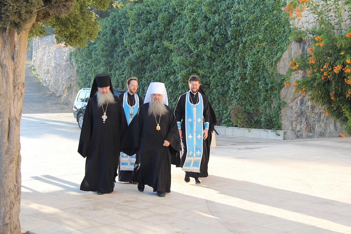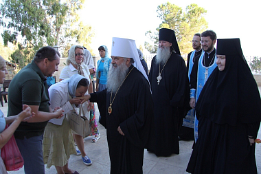 Его Высокопреосвященству сослужил начальник Русской духовной миссии архимандрит Александр (Елисов), заместитель начальника Русской духовной миссии иеромонах Дометиан (Маркарян), клирики обители и паломники в священном сане.