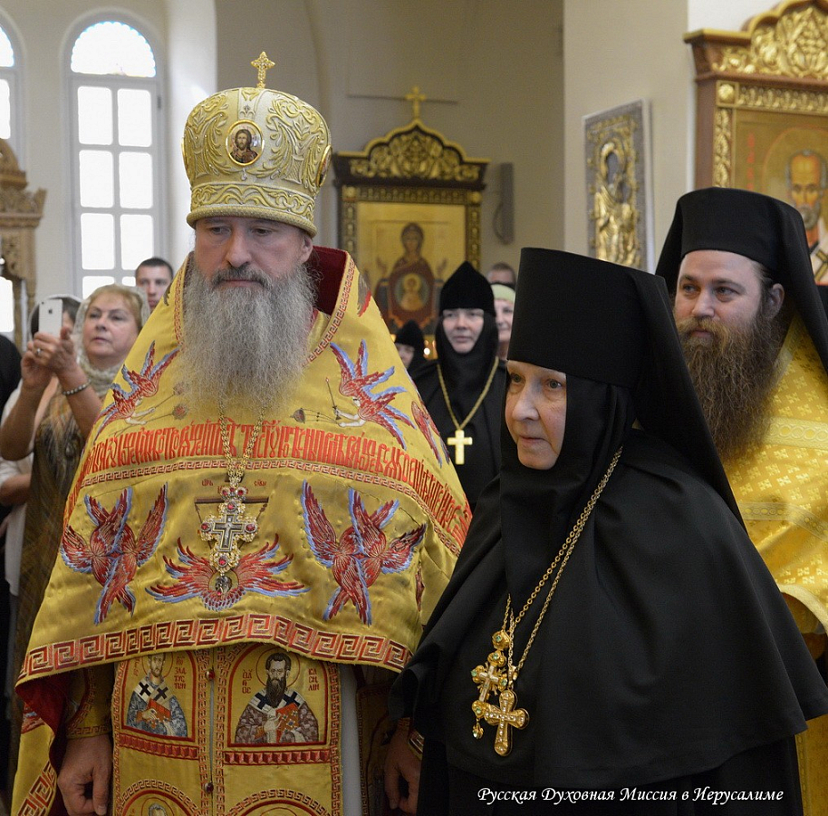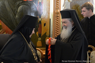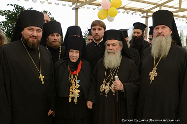По окончании богослужения митрополиты Тамбовский Феодосий, Капитолиадский Исихий, начальник Русской Духовной миссии архимандрит Александр, клирики Миссии и духовенство из числа паломников торжественно приветствовали Блаженнейшего Патриарха Иерусалимского и всей Палестины Феофила III, прибывшего в Горненский монастырь, чтобы разделить с матушкой игуменией, паломниками и всем освященным собором радость праздника.