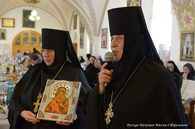 Затем гости обители были приглашены на официальный прием, где прозвучали поздравления в адрес матушки.