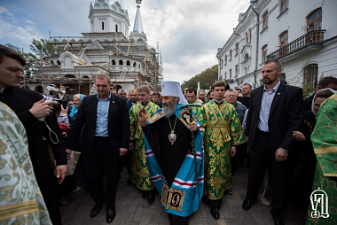 Затем состоялся крестный ход к памятнику Пресвятой Богородицы, у которого Предстоятель Украинской Православной Церкви совершил молебен преподобным отцам Святогорским.