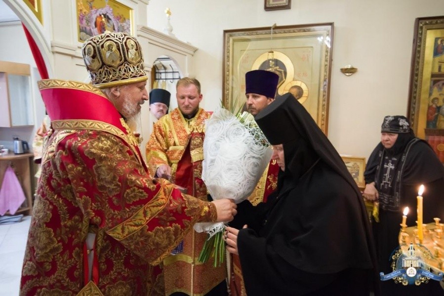 По окончании Литургии архиепископ Стефан поздравил игумению Веру с днем Ангела и 25-летием возведения в сан игумении, и пожелал обильной помощи Божией в несении ею послушания в попечении об обители и духовном окормлении сестер.