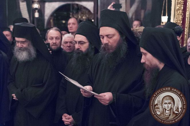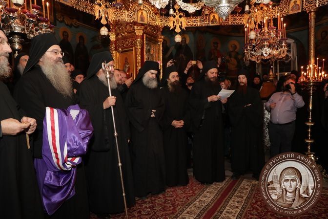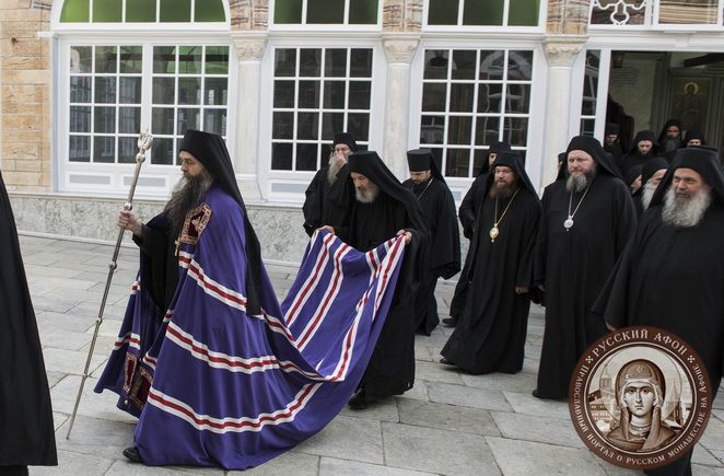 В составе кинотской Эпитропии в Русский монастырь прибыли антипросоп Великой Лавры иеромонах Никодим, антипросоп монастыря Ставроникита иеромонах Филимон, антипросоп монастыря Кутлумуш иеромонах Филофей, антипросоп монастыря Ксиропотам о. Павел, антипросоп монастыря Ксенофонт иеромонах Григорий и архиграмматеос (старший секретарь) Священного Кинота иеромонах Феофил. Также для участия в торжественной церемонии прибыли игумен Сербского монастыря Хиландар Мефодий и представители других обителей Афона: иеромонах Симеон Дионисиатский, иеромонах Георгий Ватопедский, иеромонах Димитрий Григориатский, иеромонах Тихон Симонопетрский, иеромонах Гавриил из скита Белозерка.