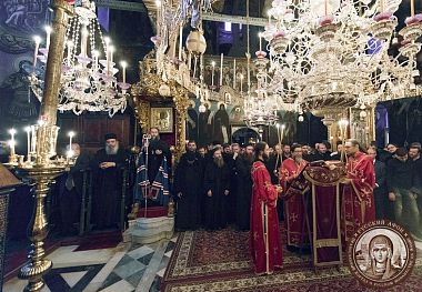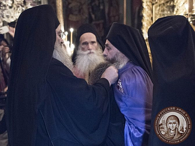 По совершении часов поставляемый иеромонах Евлогий был подведен к членам Кинотской Эпитропии. Архиграмматеос иеромонах Феофил зачитал послание Священного Кинота новоизбранному игумену Русского монастыря со всей во Христе братией.