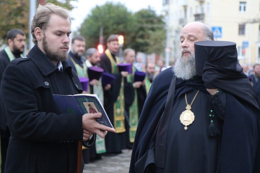 У памятника святому Афанасию Брестскому, установленного рядом с кафедральным собором, архиерей прочитал молитву преподобномученику Афанасию. В пути к торжественному шествию присоединились крестные ходы из женского монастыря Рождества Пресвятой Богородицы, что на Госпитальном острове Брестской крепости, а также из прихода храма Рождества Христова г. Бреста.