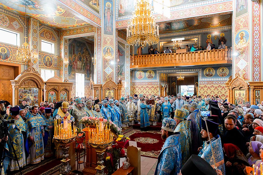 Праздничная Божественная литургия была совершена в Софийском соборе Иверско-Серафимовского женского монастыря, под сводами которого с вечера 4 октября пребывает чудотворный Курский-Коренной образ Царицы Небесной. По благословению Святейшего Патриарха Московского и всея Руси Кирилла принесение великой святыни православия в пределы Казахстанского митрополичьего округа осуществляется с 4 по 11 октября.