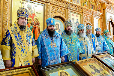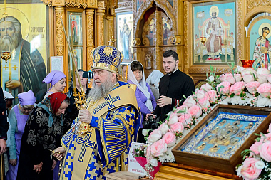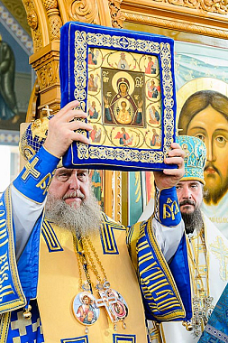 В завершение Литургии духовенство, хор и верующие совершили славление Пресвятой Богородице перед Ее чудотворным образом.