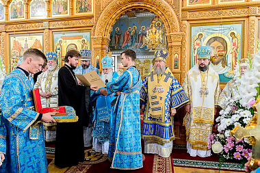 Митрополит Ташкентский и Узбекистанский Викентий зачитал текст Патриаршего поздравления митрополиту Александру с 30-летием со дня епископской хиротонии. От епископата, духовенства и паствы Среднеазиатского митрополичьего округа иерарх преподнес Предстоятелю Православной Церкви Казахстана наперсный крест и панагии.