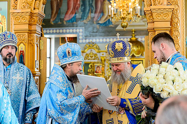От духовенства Алма-Атинской епархии со словами благопожеланий к митрополиту Александру обратился благочинный приходов Южной столицы протоиерей Валерий Захаров. Отец благочинный преподнес владыке-митрополиту на молитвенную память архипастырский жезл. Чествуемому иерарху священнослужители преподнесли святую просфору и букет цветов.