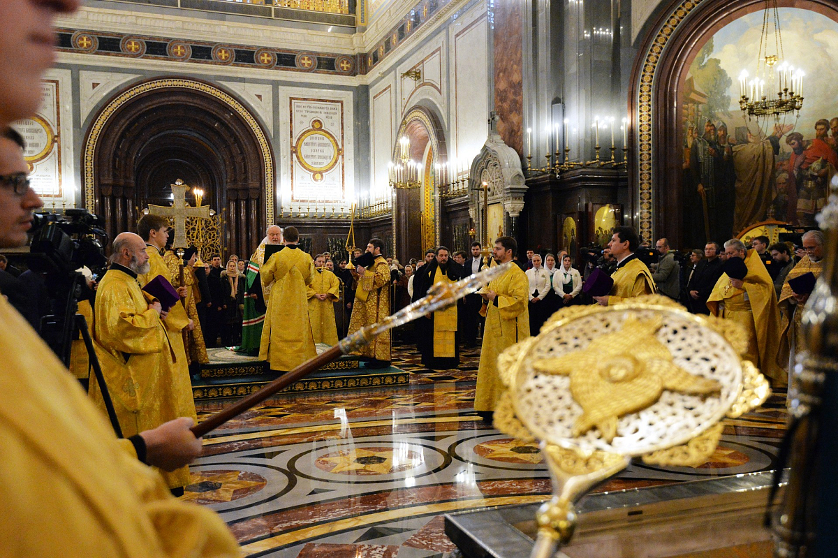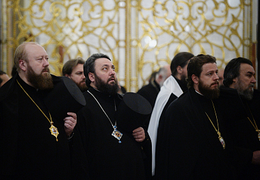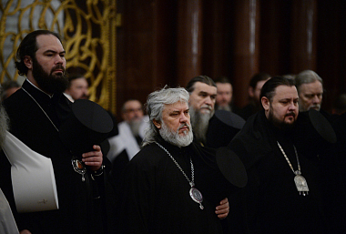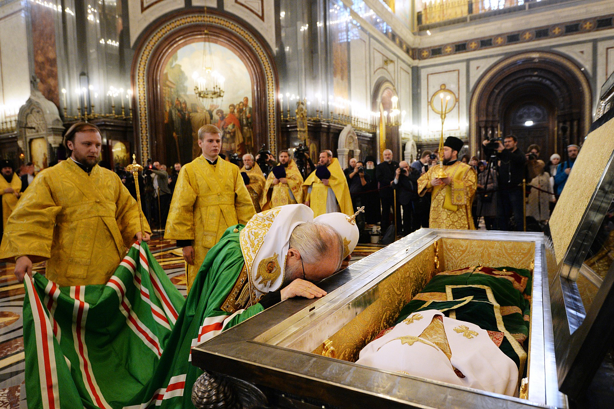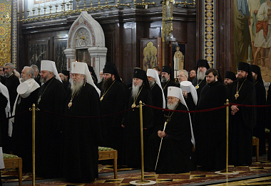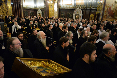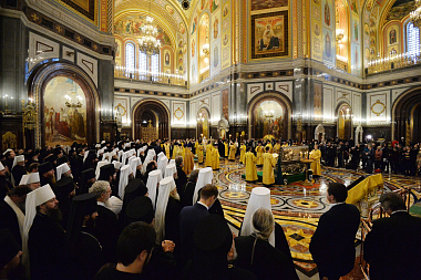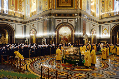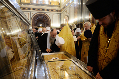 К началу Собора в Храм Христа Спасителя из Донского ставропигиального мужского монастыря были принесены честные мощи святителя Тихона, Патриарха Московского.