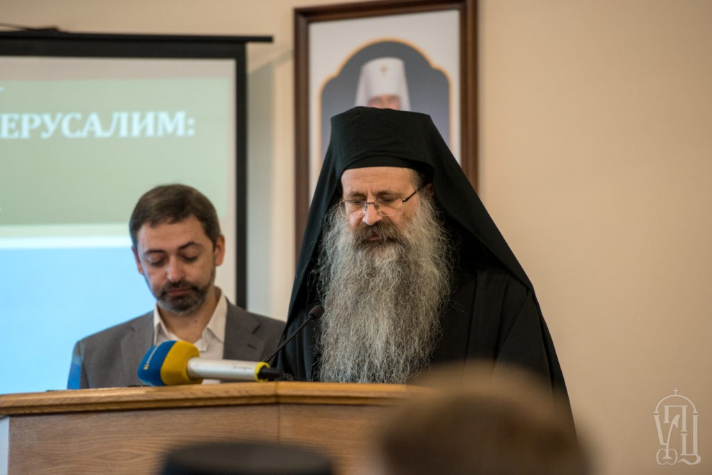 Наместник Киево-Печерской лавры митрополит Вышгородский и Чернобыльский Павел поблагодарил владыку Онуфрия и передал слово ректору Киевских духовных школ епископу Белогородскому Сильвестру. Владыка Сильвестр отметил важность связей Киево-Печерской лавры со Святой Горой Афон и Иерусалимом и пригласил заместителя начальника Русской духовной миссии в Иерусалиме иеромонаха Дометиана (Маркаряна) огласить приветственное слово к участникам конференции Блаженнейшего Патриарха Иерусалимского Феофила III.