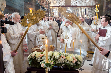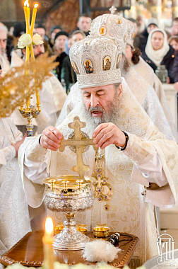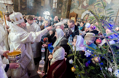 По окончании богослужения Блаженнейший владыка совершил в храме чин великого освящения воды и окропил всех молящихся великой агиасмой под пение тропаря праздника Богоявления.