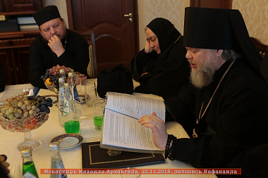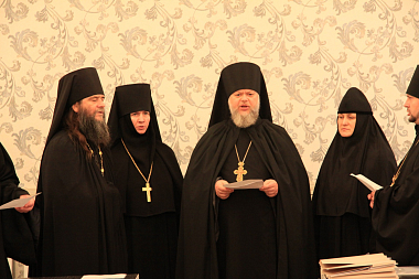 Собрание монашеской секции было разделено на два этапа. Первый проходил 19 ноября в Спасском женском монастыре г. Ульяновска. Настоятельница обители игумения Сергия (Вотрина) тепло приняла гостей монастыря: монашествующих клириков епархии, гостей-монахинь Комаровского Михаило-Архангельского монастыря игумению Магдалину (Митропольскую) с сестрами. Матушка Сергия показала гостям активно строящиеся храмы обители и колокольню. Руководитель епархиального отдела по монастырям и монашеству, настоятель Новоседмиезерного Свято-Пантелеимоновского Архиерейского подворья г. Ульяновска игумен Алипий (Кудрин) предложил начать заседание с молебна перед Нерукотворенным Образом Спасителя о мире в Церкви. Помолившись, участники секции выразили полную поддержку усилиям священноначалия Русской Православной Церкви в деле умиротворения страждущей украинской части нашей Поместной Церкви.