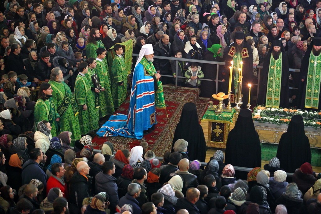 Всенощное бдение в канун праздника и позднюю Божественную литургию 1 января 2016 года при многочисленном стечении верующих в Спасо-Преображенском соборе обители совершил митрополит Хустский и Виноградовский Марк.