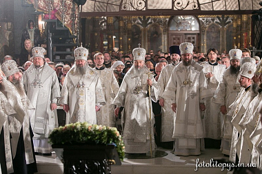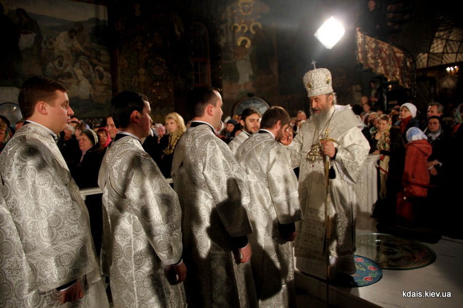 В завершение в Крестовоздвиженском храме Киево-Печерской лавры Предстоятеля Украинской Православной Церкви с Рождеством Христовым поздравили студенты Киевских Духовных школ и прихожане храмов Киевской епархии.