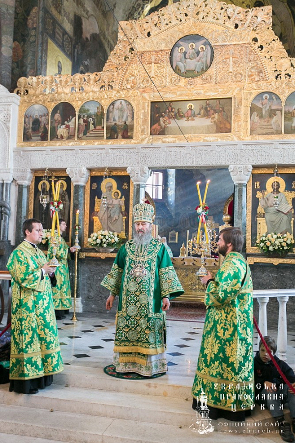 За Литургией Его Блаженству сослужили: наместник обители митрополит Вышгородский и Чернобыльский Павел; управляющий делами Украинской Православной Церкви митрополит Бориспольский и Броварской Антоний; митрополит Черниговский и Новгород-Северский Амвросий; архиепископы Житомирский и Новоград-Волынский Никодим, Нежинский и Прилукский Ириней, Роменский и Бурынский Иосиф, Северодонецкий и Старобельский Никодим, Бучанский Пантелеимон, Макаровский Иларий; епископы Боярский Феодосий, Фастовский Дамиан, Бородянский Варсонофий, Васильковский Николай, Золотоношский Иоанн, а также духовенство монастыря.