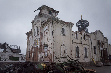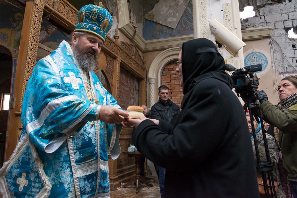 Несмотря на холодную погоду и порывистый ветер, храм, в котором разрушены крыша и стены, был переполнен молящимися. Многие в этот исторический день причастились Святых Христовых Таин.