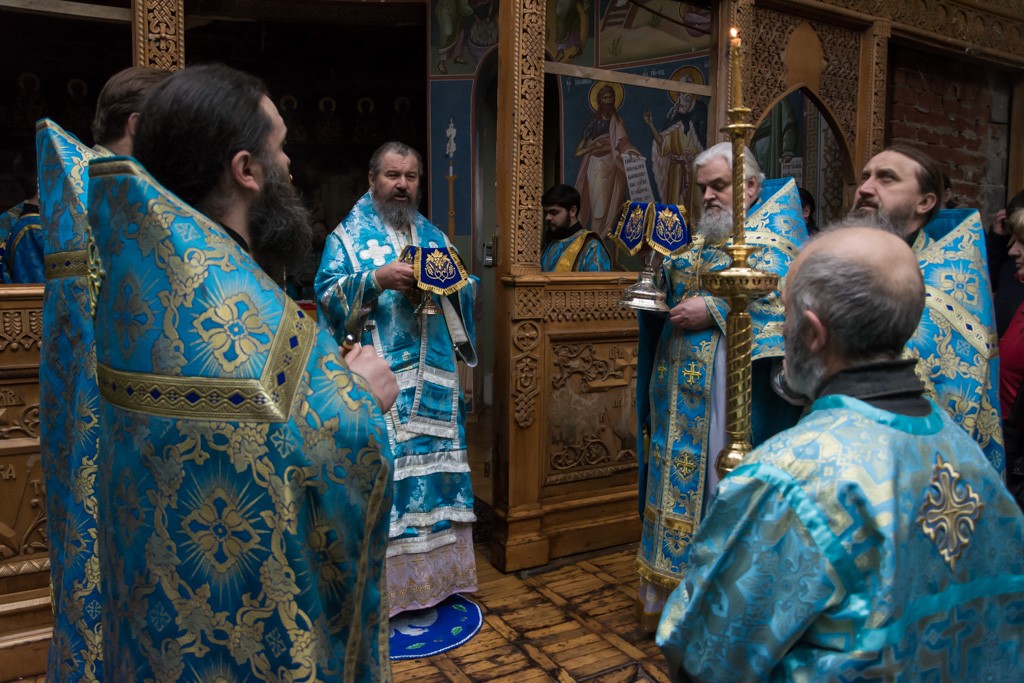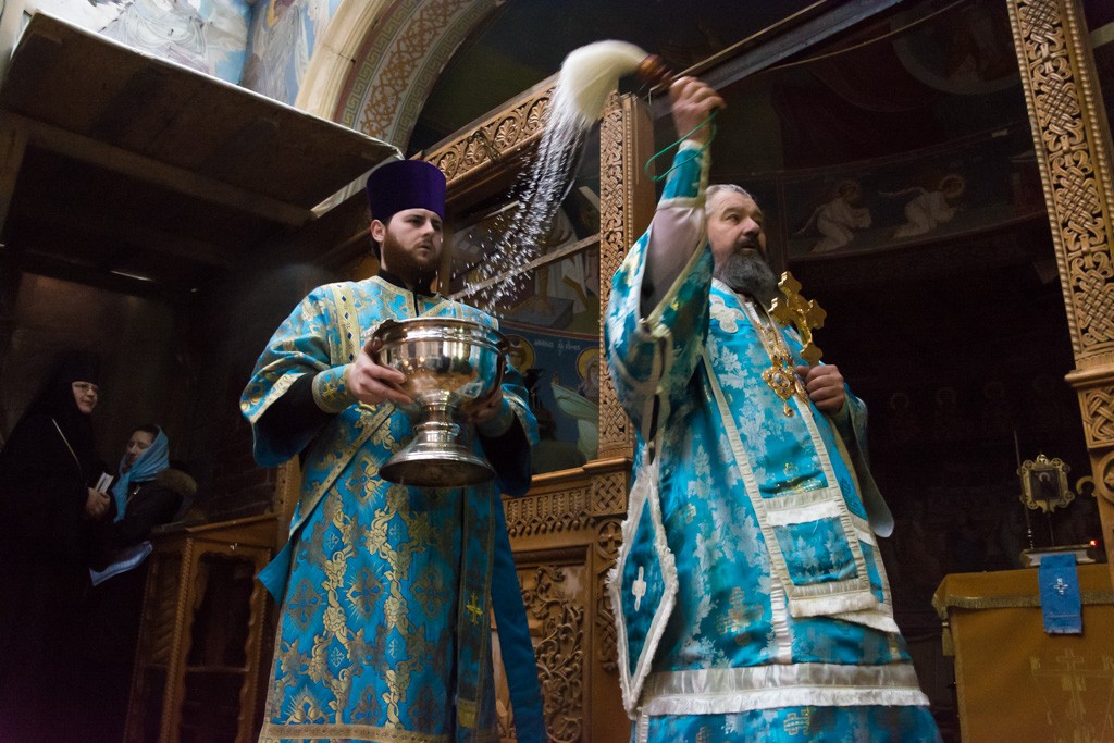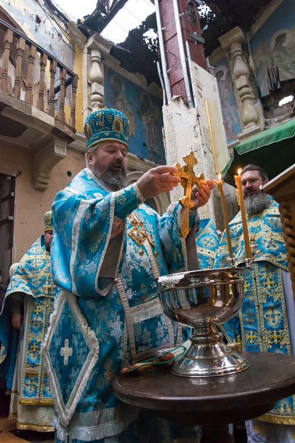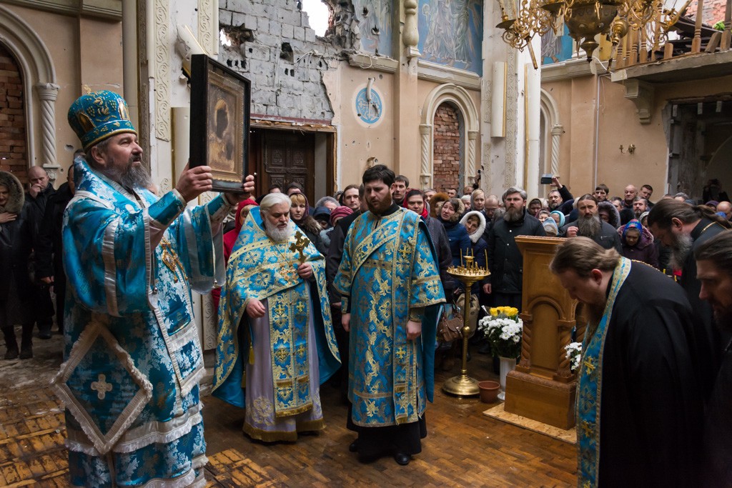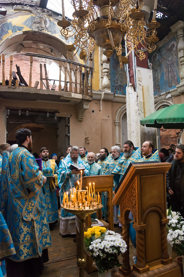 Началось праздничное богослужение молебном с водосвятием. Затем архиерей прочел особые молитвы «на отверзение храма», были окроплены освященной водой алтарь, стены и уцелевшее основание иконостаса. Множество паломников и прихожан смогли добраться в обитель Пресвятой Богородицы в этом отдаленном уголке города благодаря помощи неравнодушных людей. Игумения обители Михаила (Шевченко) и волонтеры из разных приходов Донецка приложили немало усилий для того, чтобы отпраздновать в монастыре престольный праздник. Они начали устранять последствия боевых действий: вывезли много мусора, подготовили территорию обители и сам храм.