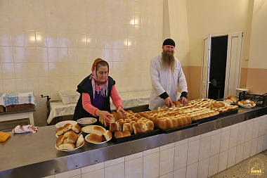 Прибывших провели в паломническую трапезную, где их ожидала подготовленная монастырской братией обеденная трапеза. По её окончании вынужденные переселенцы отправились в базу отдыха «Жемчужина Донбасса», из монастырской трапезной их снабдили в дорогу несколькими поддонами пирожков.