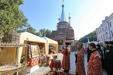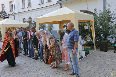 Открытию первой Святогорской ярмарки в Святых Горах предшествовал молебен с водосвятием, который возглавил насельник обители архимандрит Амвросий (Бобров). На молебне испрашивалось Божие благословение на начало доброго дела. По его окончании всех присутствующих и всю продукцию, представленную на ярмарке, окропили святой водой.
