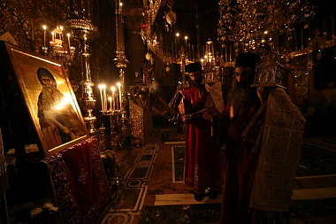 Поздним вечером началось праздничное всенощное бдение. Во время литии по традиции Ватопедского монастыря в зале собраний состоялось заседание, в котором приняли участие гости, паломники и насельники обители. Обращаясь к присутствовавшим, архиепископ Антоний передал им благословение Святейшего Патриарха Кирилла и поделился размышлениями о значении подвига преподобного Максима Грека. Иерарх отметил, что Русская Церковь с благодарностью помнит о вкладе Ватопедского монастыря в дело утверждения Православия на Святой Руси и почитает преподобного Максима как образец монашеского послушания, как великого просветителя и исповедника.