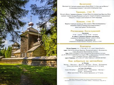 Буклет оформлен красочными фотографиями, содержит краткую историческую справку, сведения о современном возрождении пустыни, информацию о храмах, о том, как празднуют престольный праздник обители. Также повествуется о визите митрополита Петрозаводского и Карельского Константина в августе 2016 года.