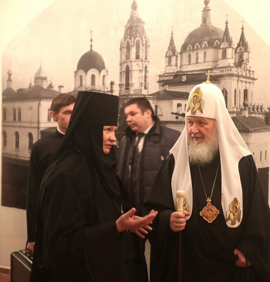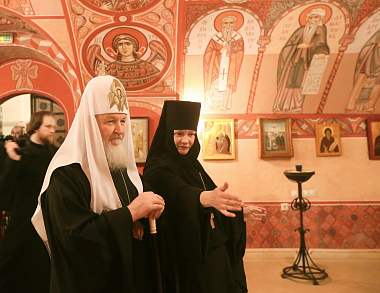 Затем в сопровождении игумении Иулиании Святейший Владыка посетил помещения, расположенные в нижней части собора Рождества Пресвятой Богородицы, – храмы в честь Иконы Божией Матери «Неопалимая Купина» и в честь Собора преподобных отец и жен, в подвиге просиявших, костницу с останками, найденными в ходе археологических работ перед началом строительства собора, церковно-исторический музей и классные комнаты Воскресной школы.