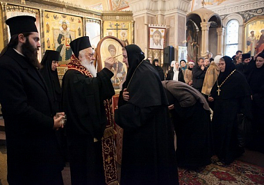 В Свято-Елизаветинском женском монастыре г. Минска 10 ноября прошла монашеская секция Регионального этапа XXV Рождественских образовательных чтений «1917–2017. Монастыри и монашество: уроки столетия», в которой приняли участие игумены, игумении, монашествующие монастырей Белорусской Православной Церкви. В эти же дни на Белорусскую землю была впервые принесена десница великомученика Димитрия Солунского. Делегацию Элладской Православной Церкви возглавил митрополит Верии, Науссы и Камбании Пантелеимон (Калпакидис). 10 ноября мощи были привезены в Свято-Елисаветинский монастырь, где проходила монашеская секция регионального этапа Рождественских Чтений. Все участники собрания встречали святые мощи в храме «Державной» иконы Божией Матери, после чего игумены и игумении проследовали в нижний храм святых Царственных Мучеников, где состоялось небольшое общение с Митрополитом Пантелеимоном, расшифровку которого публикуем ниже.