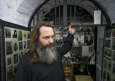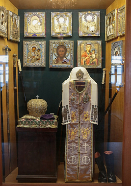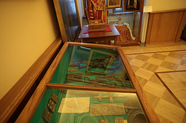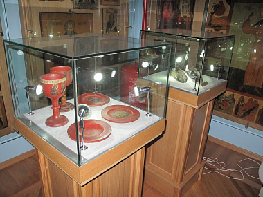 Сандалии, как указано на витрине (хотя они больше похожи на тапочки, однако у современного человека может появиться ассоциация с домашними тапочками, поэтому так подписали), были изготовлены преподобным Сергием. Он сам их выкроил из натуральной кожи, сам сшил. По написанному преданию, 30 лет пролежал в них во гробе. С тех пор, как его ученик преподобный Никон, первый игумен нашей святой обители, в 1422 году обрел во время строительства нового храма нетленные мощи своего учителя и наставника, и началось почитание святого: тапочки-сандалии Преподобного и нетленные его одежды неотлучно находятся в Лавре. Это фелонь, епитрахиль, поручи, еще есть посох. А тапочки-сандалии были переданы нам в Академический музей... Что касается богослужебных сосудов, это вопрос, вырезал ли их сам Преподобный или нет. Но имеется одна важная деталь: священные сосуды из нашей экспозиции прежде стояли возле раки с мощами преподобного Сергия. По всей вероятности, ученики святого хранили богослужебные сосуды периода земной жизни Преподобного как зеницу ока и потом, видимо, в знак того, что те всегда находились рядом с аввой, сделали их копии. В итоге получилась некая музейная экспозиция: сандалии, богослужебные сосуды. А еще, если Вы посмотрите на дореволюционные литографии, то увидите прямо над ракой фелонь преподобного Сергия. Ну кто бы мог подумать, что ученики Преподобного захотят сотворить музей? Но они сохранили все эти вещи как знак неотъемлемого пребывания с ними Игумена Земли Русской. Сделали это для того, чтобы память о нем не оскудевала. И мы, спустя семь с лишним веков, прекрасно понимаем, что преподобный Сергий, наш отец, – авва. Знаете, с чего я начинаю свой разговор с вновь пришедшими студентами на уроке, будь это такой предмет, как Церковный устав или Литургика, или история Русской Церкви, которые я преподаю? С поразительного момента из жития Преподобного. Откровенно говорю им: «Ребята, вспомните, пожалуйста, что, будучи отроком, преподобный Сергий "ели бредяху по Псалтири": грамота давалась ему плохо, за что учитель его наказывал, товарищи над ним насмехались, родители печалились. Вспомните, как со слезами на глазах отрок взмолился ко Господу и, получив от Бога через ангелоподобного старца-черноризца частицу святой просфоры, стал читать по-другому – стройно и без труда. В этом – чудо для преподобного Сергия, но в то же время и назидание для студентов: если ты плохо читаешь, ты ученик Преподобного. Обратись сердцем ко Господу, попроси Всевышнего даровать тебе книжное разумение! А если ты хорошо читаешь и при этом задираешь нос, Боженька тебя обязательно смирит». И гостям я обычно говорю: «Вы приехали сюда не ко мне, не в Академию, не в Лавру, а к преподобному Сергию, – значит, вы тоже его ученики Его. Он вас сюда привел. Помолитесь в храме, приложитесь к чудотворным мощам святого и не забудьте посетить наш Церковно-археологический кабинет, который не просто музей, а именно Кабинет – то есть особая учебная аудитория как для студентов Московских Духовных школ, так и для всех вас».