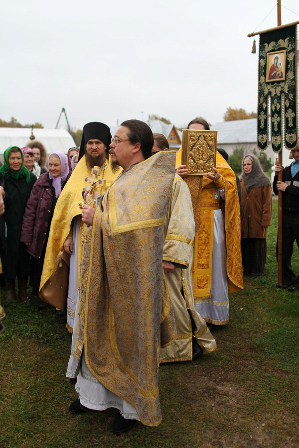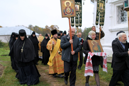 Настоятельница обители игумения Раиса (Шибеко) с небольшой тогда сестринской общинкой приступила к возрождению разрушенной обители весной 1999 года, о чем она подробно рассказала нашему сайту в интервью «Место тяжелое, но спасительное». Основной монастырский храм – Матери Божией «Знамение» – стоял в руинах, Божественная литургия совершалась в малом приделе Иоанна Богослова. Появление в монастыре трех икон – больших образов «Господь Вседержитель», «Знамение» Божией Матери и чудотворного – апостола и евангелиста Иоанна Богослова – восприняли здесь как чудо Божие. А было так: ровно 15 лет назад, 9 октября в малом приделе Иоанна Богослова совершалась праздничное богослужение, а на солее в разрушенном Знаменском храме накануне установили тумбочку, где после Литургии собирались служить молебен Спасителю. Именно в этот день незнакомый для многих человек пожертвовал обители красивейший образ «Господь Вседержитель», который Матушка-настоятельница с ныне почившим уже архимандритом Кириллом, настоятелем Спасо-Преображенского мужского Муромского монастыря и благочинным женских монастырей Владимирской епархии, отнесли в Знаменский храм и поставили на пустующую тумбочку, словно специально ожидавшую его. Сестры тут же зажгли свечи, а ковер они еще раньше положили. Начался молебен, многие заплакали...